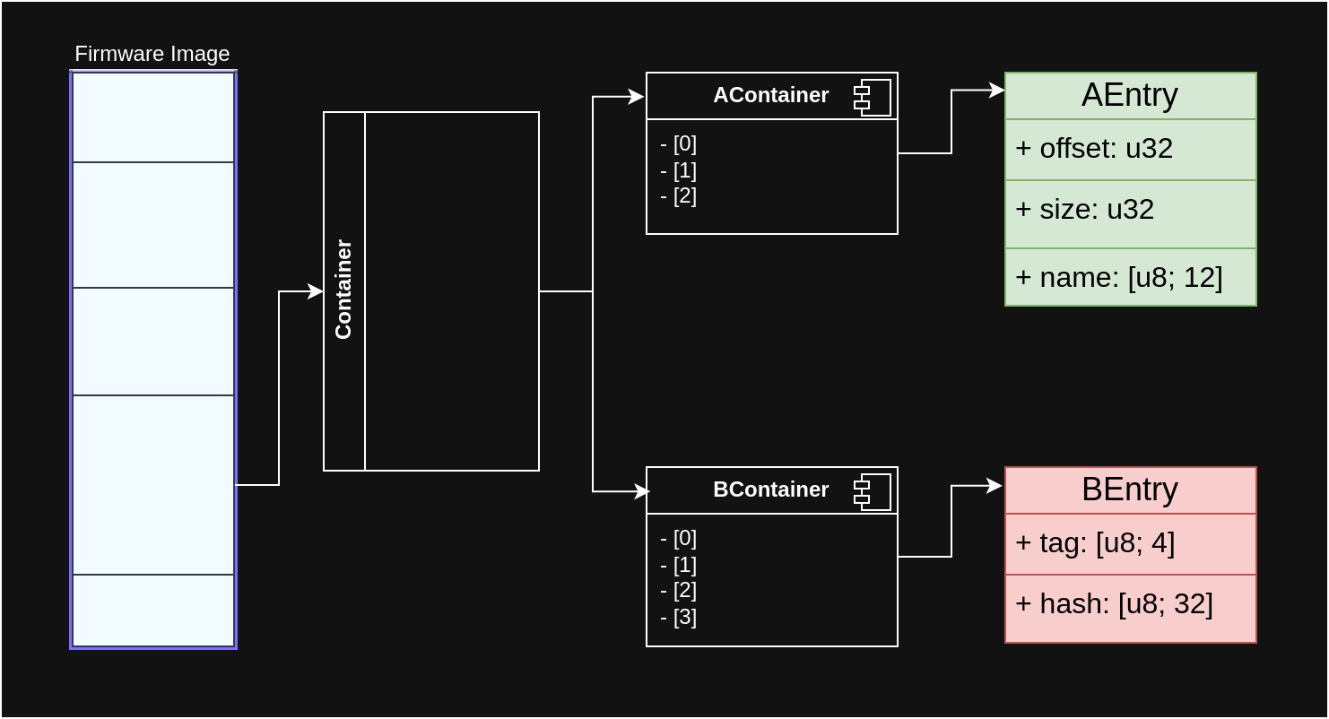 The following diagram is a generic example of a partitioned firmware image with a container that may be of either one or another kind. And in turn, it would contain one or another kind of entries.